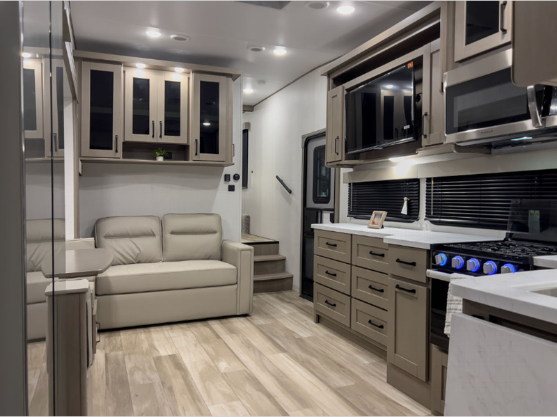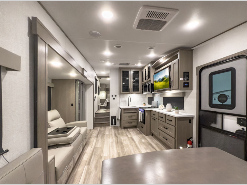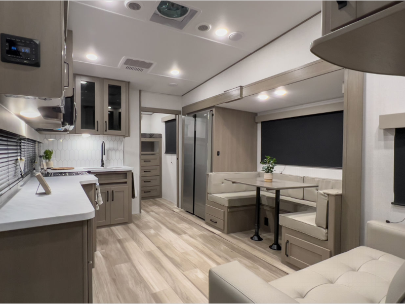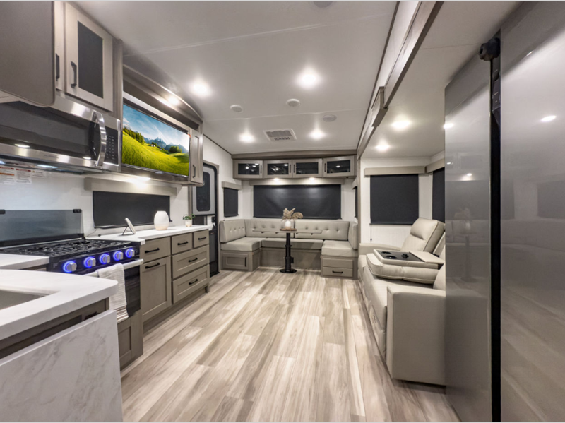 Each fifth wheel has 90-degre turning radius capabilities which allows you to be comfortable driving in town and parking into your campsite. Some construction and Arctic 4-Seasons Protection package features include a one-piece TPO roof membrane, a heated and enclosed underbelly with circulating heat, 12V heat pads on the holding tanks, and a heated pass-through storage area so you can travel and enjoy any climate. The interior offers large panoramic slide room windows for great views, premium Congoleum flooring for durability, and an On Demand water heater.